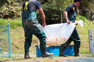 水を含んだ30キロほどの鯉をぬかるみの中から運び出す技術は素晴らしい。